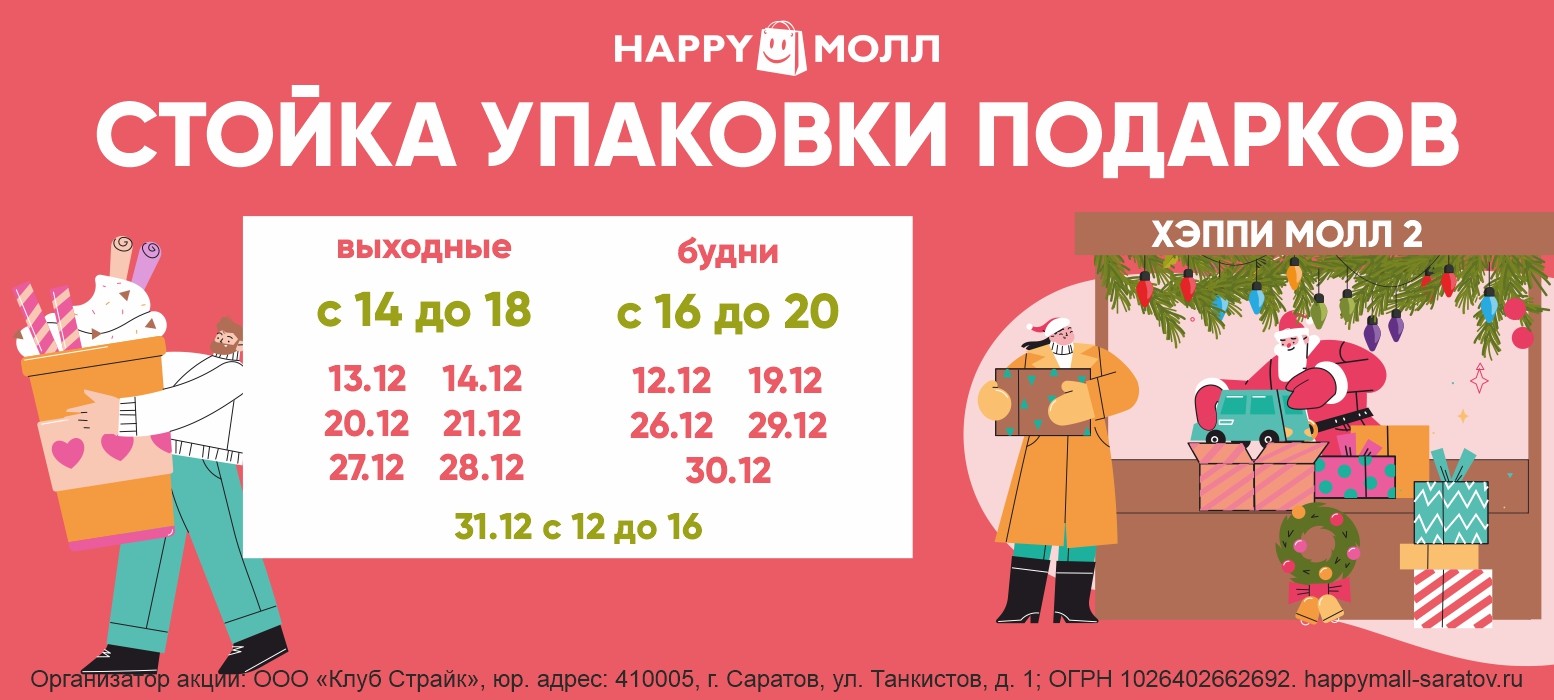 Специально для вас в HAPPY МОЛЛ открылась стойка упаковки подарков. Просто покажите чек о покупке из любого нашего магазина — и мы с любовью упакуем ваш сюрприз. Бесплатно!